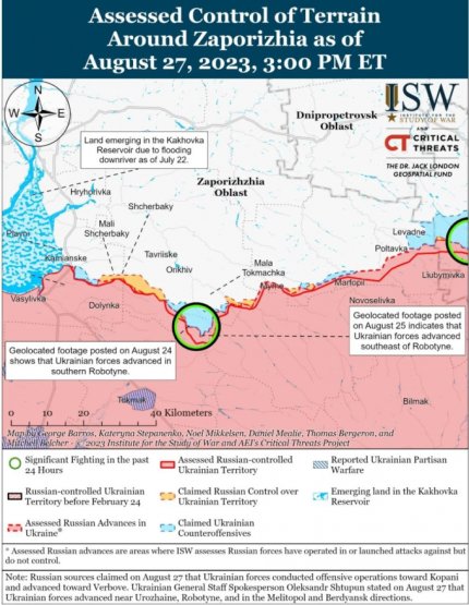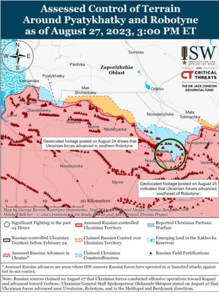 Так, ВС РФ провели дополнительные боковые перебросы в район Работино с элементами 76-й гвардейской десантно-штурмовой дивизии, действовавшей у Кременной в Луганской области. Также в начале августа РФ ввела в бой части 7-й дивизии десантников после их боковой опрокидывания в Роботино, а ныне в этот район передислоцируют неуказанные подразделения из Херсонского направления.