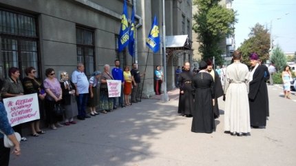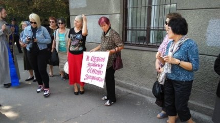 Между тем, во время заседания под зданием суда состоялась акция протеста: митингующие пришли с флагами ВО «Свобода», а одна из участниц держала плакат «Не віддамо українську святиню загарбнику».