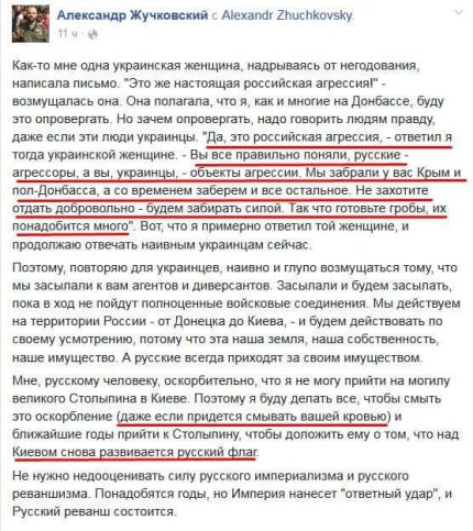 "Да, это российская агрессия, - ответил я тогда украинской женщине. - Вы все правильно поняли, русские - агрессоры, а вы, украинцы, - объекты агрессии. Мы забрали у вас Крым и пол-Донбасса, а со временем заберем и все остальное. Не захотите отдать добровольно - будем забирать силой. Так что готовьте гробы, их понадобится много", - цитирует Жучковского «Свободный Донбасс».