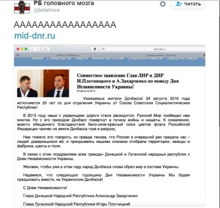 11.50- Хакеры взломали сайт так называемого "МИД" ДНР и разместили на нем поздравление с Днем независимости Украины от главаря ДНР Александра Захарченко и лидера ЛНР Игоря Плотницкого.