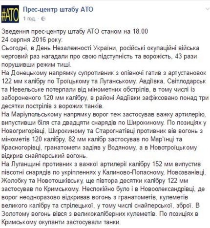 18.31 Война, к сожалению, продолжается. На фронте гибнут украинские бойцы. По данным пресс-центра штаба АТО, на День Независимости боевики устроили 43 обстрела в Донецкой и Луганской областях