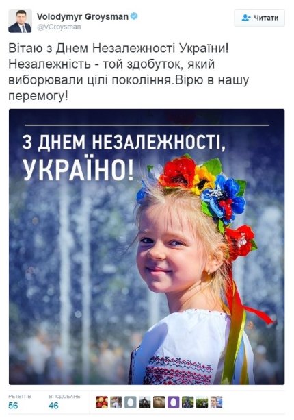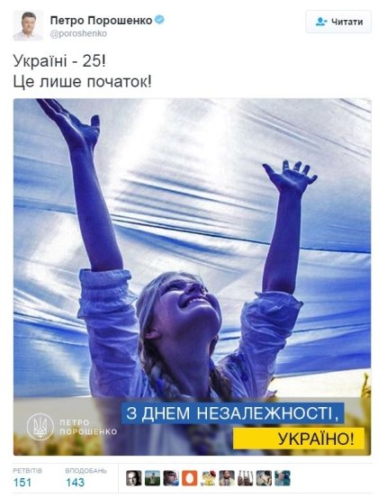 08.47- Главные лица государства уже поздравили украинцев в соцсетях. Президент Украины Петр Порошенко и глава правительства Владимир Гройсман опубликовали праздничные твиты.