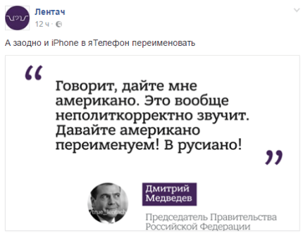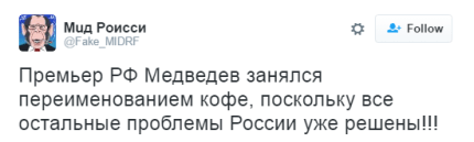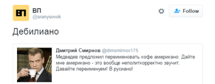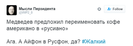 Напомним, на заседании Евразийского межправительственного совета Медведев предложил переименовать кофе "американо" в "русиано", что, по его мнению, будет более политкорректно.