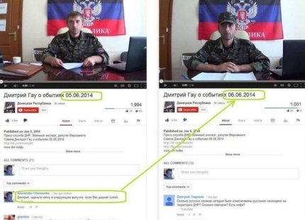 Журналист обнародовал скриншоты видеоотчетов "пресс-службы" ДНР, в которых Гау делает сводку событий в "республике" за день. На скриншоте запечатлено, что 5 мая пользователь Александр Черненко написал в комментариях к видеоролику: "Дмитрий, наденьте кепку в следующем выпуске, если Вас держат силой".