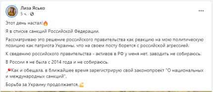 "Этот день настал! Я в списке санкций Российской Федерации. Рассматриваю это решение российского правительства как реакцию на мою политическую позицию как патриота Украины, что на своем посту борется с российской агрессией. К сведению российского правительства - активов в РФ у меня нет, заводить не собираюсь. В России я не была с 2014 года и не собираюсь", - добавила Ясько.