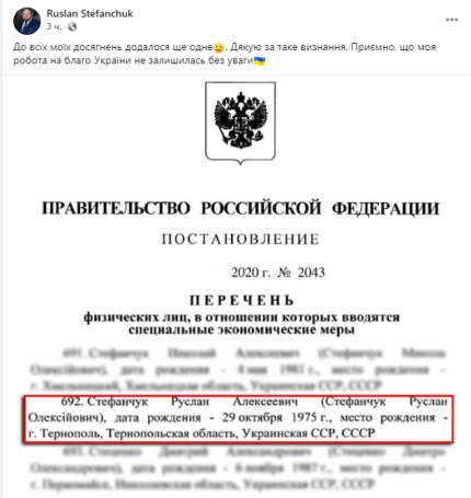 "Ко всем моих достижений прибавилось еще одно. Спасибо за такое признание. Приятно, что моя работа на благо Украины не осталась без внимания", - ответил на новые санкции России первый заместитель председателя Верховной Рады Руслан Стефанчук.
