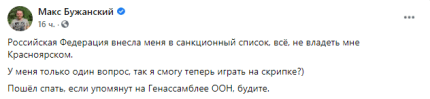 Народный депутат от "Слуги народа" Максим Бужанский с иронией и юмором отреагировал на решение российского правительства ввести санкции против украинских нардепов. Он в ответ уточил у команды Путина, можно ли ему теперь играть на скрипке.