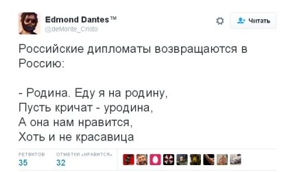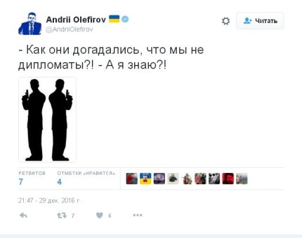 Так, посол Украины в Финляндии Андрей Олефиров, который раньше вызвал негодование россиян шуткой про "Боярышник", написал в соцсети: "Шпионом можешь ты не быть, но дипломатом быть обязан".