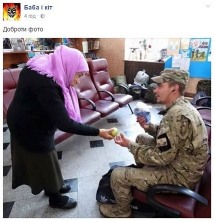 Отметим, что фото пожилой женщины и военного за несколько часов публикации собрал почти 800 "лайков" и 80 "репостов". Пользователь Юрий Куриный прокомментировал фото: "Вспомнился рассказ из Библии о старой и двух драхмах. Часто бедные люди дают больше чем другие".