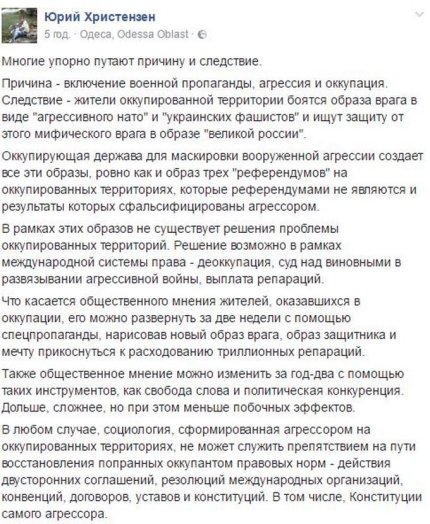 "В любом случае, социология, сформированная агрессором на оккупированных территориях, не может служить препятствием на пути восстановления попранных оккупантом правовых норм - действия двусторонних соглашений, резолюций международных организаций, конвенций, договоров, уставов и конституций. В том числе, Конституции самого агрессора", - резюмировал Юрий Христензен.