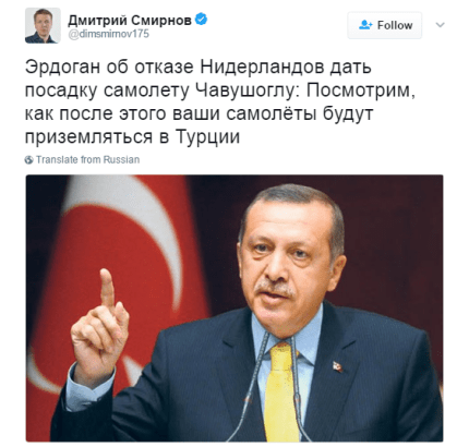 Стоит отметить, что россияне обрадовались заявлению Эрдогана. Так, журналист кремлевского пула Дмитрий Смирнов процитировал турецкого лидера в своем микроблоге в Twitter.