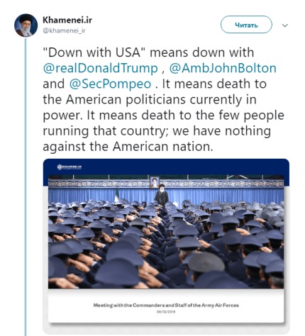"Лозунг "Долой США" означает долой (президента Дональда) Трампа, (помощника президента по национальной безопасности Джона Болтона и (госсекретаря Майка) Помпео. Это означает смерть для немногих людей, которые руководят этой страной. Мы не имеем ничего против американского народа", - написал Хаменеи.