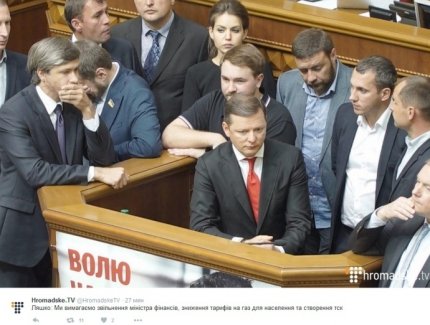 Лидера «радикалов» Олег Ляшко потребовал увольнения министра финансов и снижения тарифов на газ для населения, а также пообещал, что блокирование трибуны продолжится до тех пор, «пока не будут выполнены наши условия».