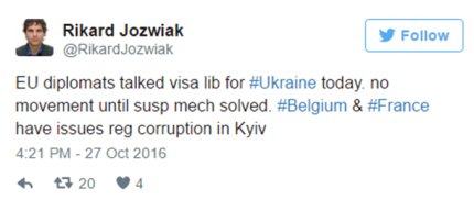 "Дипломаты ЕС обсудили визовую либерализацию для Украины. Никакого прогресса не будет до решения вопроса с механизмом приостановления. В Бельгии и Франции возникли вопросы по поводу борьбы с коррупцией в Киеве" - написал Йозвяк в своем Twitter.