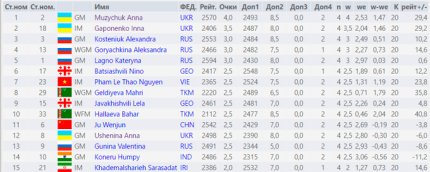 12. Анна Ушенина - 2,5 очка (2 победы, 1 ничья и 1 поражение). В пятом туре Анна сыграет с Лелой Явахишвили.