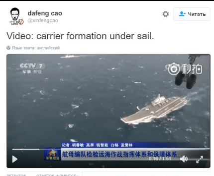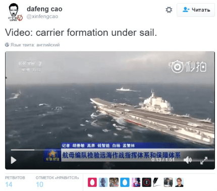 Также он обратил внимание, что российский корабль отмечает свое движение густым черным дымом, а его китайский "собрат" движется без подобных "спецэффектов".