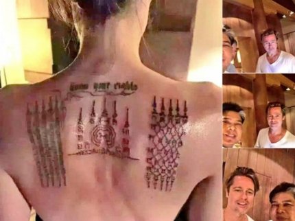 И, наконец, самая большая татуировка появилась в феврале этого года во время путешествия в Камбоджу. Джоли украсила спину тайскими буддистскими символами, которые предназначены для защиты от негативных воздействий и для сохранения здоровья. Аналогичный рисунок и теми же чернилами набил себе и Брэд Питт, только под грудью.