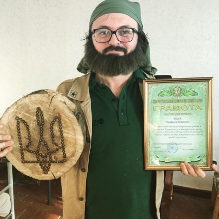 Также музыкант похвастался грамотой, которую получил от Краматорского пограничного отряда и подарком в виде сделанного из гвоздей герба на срубе дерева.