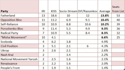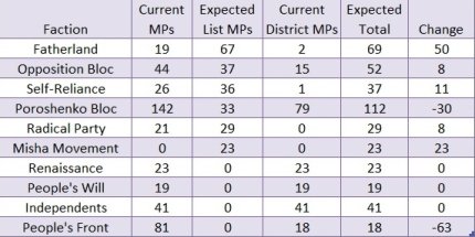 Тем не менее, эффект Савченко может легко увеличить общее количество голосов "Батькивщины" на 5%. Это дало бы фракции шестьдесят девять мест в парламенте, делая её второй по величине после "Блока Петра Порошенко" со 112 местами. Оппозиционный блок тогда будет третьим с 52-мя членами.