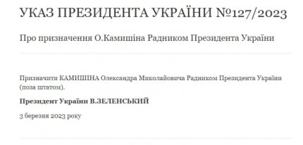 3 марта появился указ на сайте президента Украины о том, что Александр Камышин, до этого возглавлявший Укрзализныцю, назначен на должность внештатного советника Владимира Зеленского.