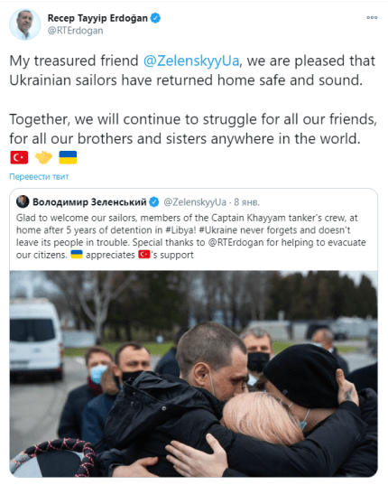 "Мой дорогой друг Владимир Зеленский. Мы рады, что украинские моряки вернулись домой живыми и невредимыми. Вместе мы продолжим вести борьбу во имя всех наших друзей, братьев и сестер по всему миру", — написал Эрдоган.
