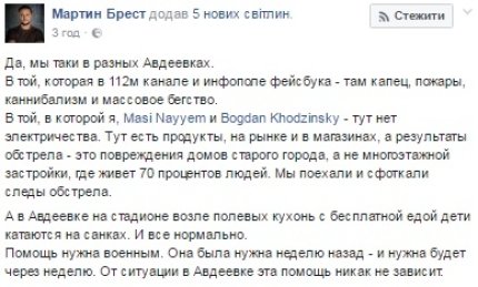 "Да, мы таки в разных Авдеевках. В той, которая на 112-м канале и в инфополе фейсбука - там капец, пожары, каннибализм и массовое бегство. В той, в которой я, Masi Nayyem и Bogdan Khodzinsky - тут нет электричества. Тут есть продукты, на рынке и в магазинах, а результаты обстрела - это повреждения домов старого города, а не многоэтажной застройки, где живет 70 процентов людей", - написал он.