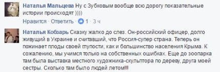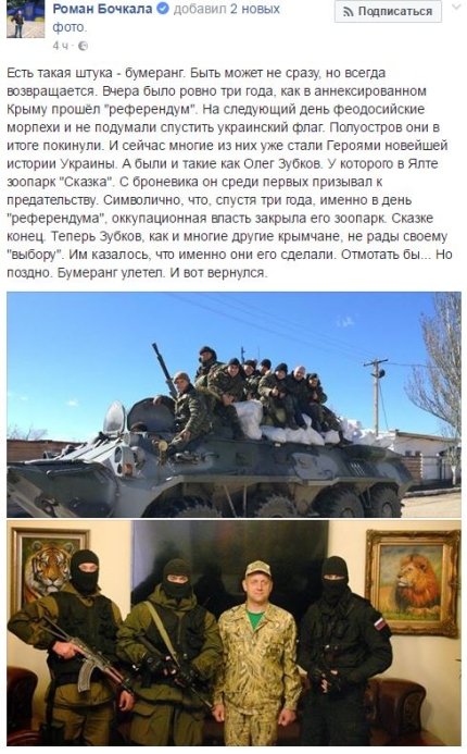 "Есть такая штука - бумеранг. Быть может не сразу, но всегда возвращается. Вчера было ровно три года, как в аннексированном Крыму прошёл "референдум". На следующий день феодосийские морпехи и не подумали спустить украинский флаг. Полуостров они в итоге покинули. И сейчас многие из них уже стали Героями новейшей истории Украины. А были и такие как Олег Зубков. У которого в Ялте зоопарк "Сказка". С броневика он среди первых призывал к предательству. Символично, что, спустя три года, именно в день "референдума", оккупационная власть закрыла его зоопарк. Сказке конец. Теперь Зубков, как и многие другие крымчане, не рады своему "выбору". Им казалось, что именно они его сделали. Отмотать бы... Но поздно. Бумеранг улетел. И вот вернулся", - написал украинский журналист Роман Бочкала.