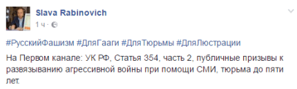 "На Первом канале: Уголовный кодекс РФ, Статья 354, часть 2, публичные призывы к развязыванию агрессивной войны при помощи СМИ, тюрьма до пяти лет", - написал он в своем Facebook.