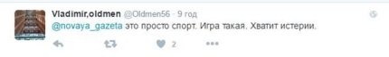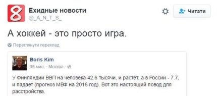 В то же время, Дядя Саша написал: "Верховный суд Чеченской республики отменил победу хоккейной сборной Финляндии над Россией", на что ему пользователь под ником Олени нашего городка ответил: "и объявил сборную Финляндии в международный розыск".
