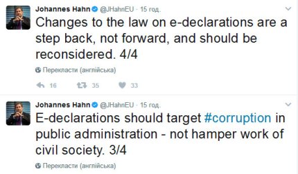 Европейский коммисар по вопросам соседства Йоханнес Хан призвал Украину отменить решение Верховной Рады о подаче электронных деклараций антикоррупционными активистами и их контрагаентами.