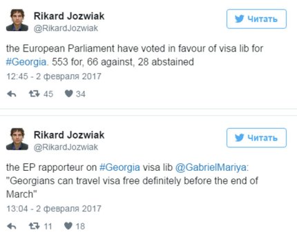 "Европейский парламент проголосовал за визовую либерализацию для Грузии. 553 "за", 66 "против", 28 - воздержались", - написал журналист.