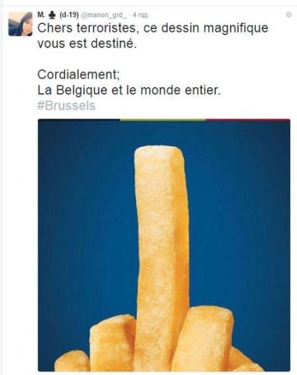 Непристойный символ, который сложили из картошки, стал одним из популярных изображений протеста против террористических актов в Бельгии. Первоначально изображение картофеля сняли из рекламы "Burger King", после чего на все лады накладывали на него изображение флага Бельгии.