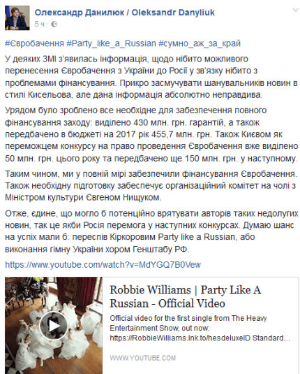 "В некоторых СМИ появилась информация, о якобы возможности переноса Евровидения-2017 из Украины в Россию в связи с якобы с проблемами финансирования. Обидно огорчать поклонников новостей в стиле Киселева, но данная информация абсолютно не соответствует действительности", ― отметил Данилюк.