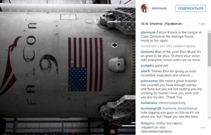 За несколько часов до Нового года Маск опубликовал в своем профиле в Instagram фото Falcon 9 с подписью "никакого существенного вреда обнаружено не было, ракета готова к новому полету".
