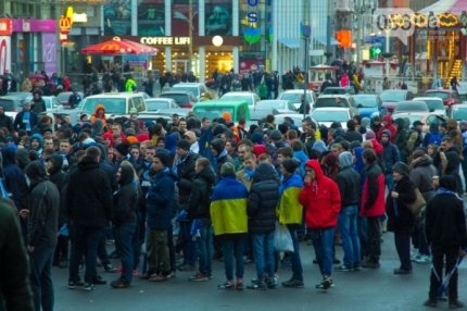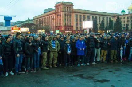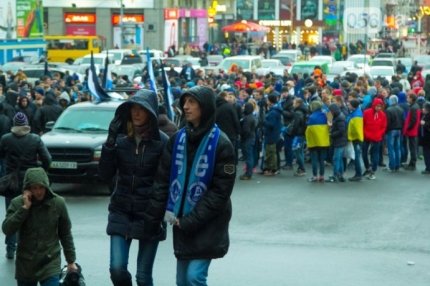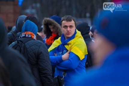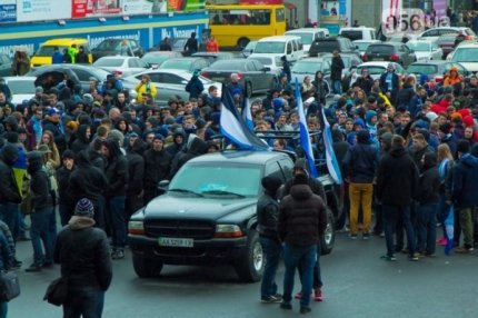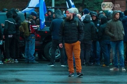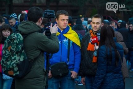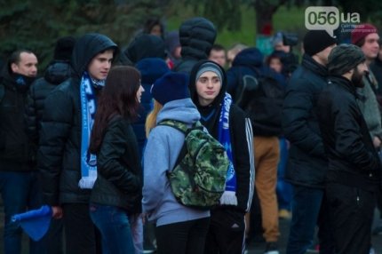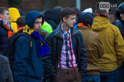 Шествие фанатов началось в центре города на площади Героев Майдана. Колонна в дружественной обстановке прибыла на "Днепр-Арену", где болельщики смотрели игру.