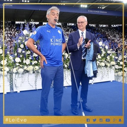 Перед началом игры на "Кинг Пауэр Стэдиум" выступил легенда мировой музыки, тенор Андреа Бочелли. Узнав о чемпионстве своего друга Клаудио Раньери, он перенес один из своих концертов, чтобы порадовать болельщиков "Лестер Сити". Бочелли исполнил свою вечную тему Con te partirò ("Я уйду с тобой") и арию Nessun dorma ("Пусть никто не спит").