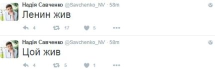 "Полный хохотач. Плуги с твиттера верифицировали фейковый аккаунт Савченко. А тот, что вела ее сестра Вера, удалили. Там твиты вроде "Цой жив", "Ленин жив", - написал известный блогер Антон Ходза.