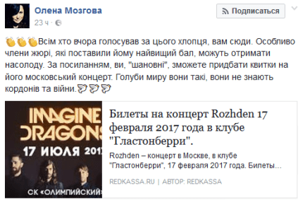 "Всем, кто голосовал за этого парня, вам сюда. Особенно члены жюри, которые поставили ему наивысший бал, могут получить наслаждение. По ссылке, вы, "уважаемые", сможете приобрести билеты на его московский концерт. Голуби мира они такие, они не знают границ и войны", - отметила она.