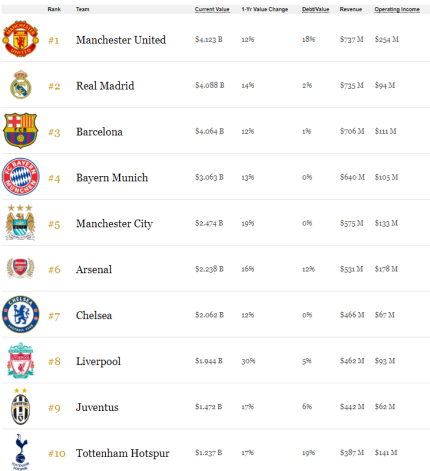 Единственным клубом, который упал в цене, является "Милан" (на 24%). Он находится на 17 строчке. Отметим, что владельцу клуба за долг, возможно, придется продать клуб, который и так находится под санкциям УЕФА.