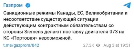 Санкционные режимы Канады, ЕС, Великобритании и несоответствие нынешней ситуации действующим контрактным обязательствам со стороны Siemens делают поставки двигателя 073 на КС "Портовая" невозможными, – жалуется руководство российской компании.