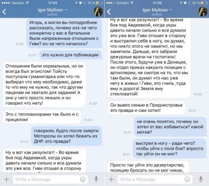 По словам Мальцева, во время тяжелых боев под Авдеевкой Гиви, опасаясь за свою жизнь, отошел от позиций батальона и выстрелил себе в ногу.