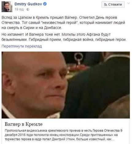 "В Кремль пришел Вагнер. Отметил День героев Отечества. Тот самый "неизвестный герой", который нанимает людей на смерть в Сирии и на Донбассе, - прокомментировал новость экс-депутат Госдумы РФ Дмитрий Гудков, известный критикой политики Путина. - Но ихтамнет. И Вагнера тоже нет. Могилы этого Афгана будут безымянными. Гибридный прием, гибридная война, гибридные герои".