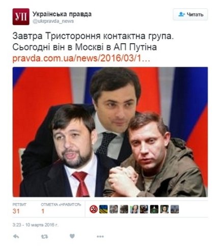 Один из главарей боевиков Донбасса Денис Пушилин 9 марта посещал Администрацию президента России Владимира Путина. Его заметили активисты группы "Война", которые проводят акцию под АП в поддержку журналистов, избитых в Ингушетии.