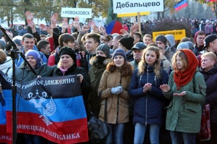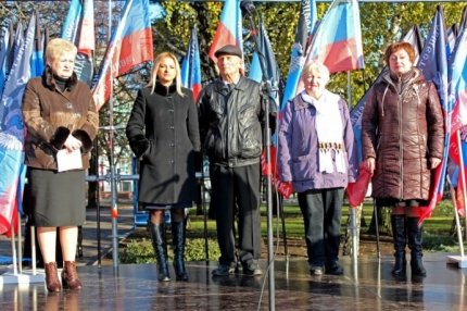 По утверждению боевиков, в Донецк съехались жители городов Кировское, Дебальцево, Новоазовск, Харцызск, Енакиево и других. Открытие митинга сопровождалось песней "Кто такие русские". После этого желающие выступили на сцене с поздравительными словами.