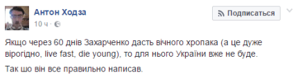 "С нуля часов сегодняшнего дня пошел отсчет, каждый день - это тот гвоздь, который вбивается в крышку гроба страны, которая называлась раньше Украина. Максимум 60 дней и государство практически перестанет существовать", — сказал Захарченко.