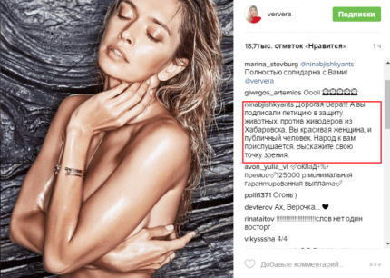 «Дорогая Вера!!! А вы подписали петицию в защиту животных, против живодеров из Хабаровска? Вы красивая женщина, и публичный человек. Народ к вам прислушается. Выскажите свою точку зрения», - призвала Брежневу комментатор ninabjishkyants.