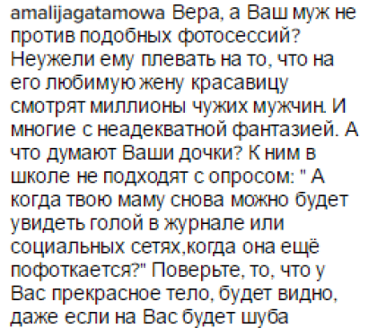 Среди комментариев под фото есть и осуждающие, и призывающие певицу прекратить вести себя так легкомысленно. «Вера, а Ваш муж не против подобных фотосессий? Неужели ему плевать на то, что на его любимую жену красавицу смотрят миллионы чужих мужчин», - возмутилась подписчица Брежневой