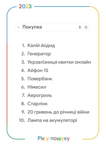 Также среди топовых запросов по поводу покупок – лидер в прошлом году генератор, онлайн билеты на Укрзализныцю, новая модель iPhone и повербанк.