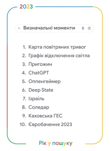 На втором месте был запрос "График отключения света", а на третьем – Пригожин. Также среди трендовых запросов года – Deep State, Израиль и Каховская ГЭС.
