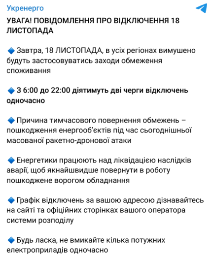 - Решения "Укрэнерго" относительно вынужденных отключений электроэнергии 18 ноября обусловлены повреждением энергообъектов во время ракетно-дроновой атаки РФ.